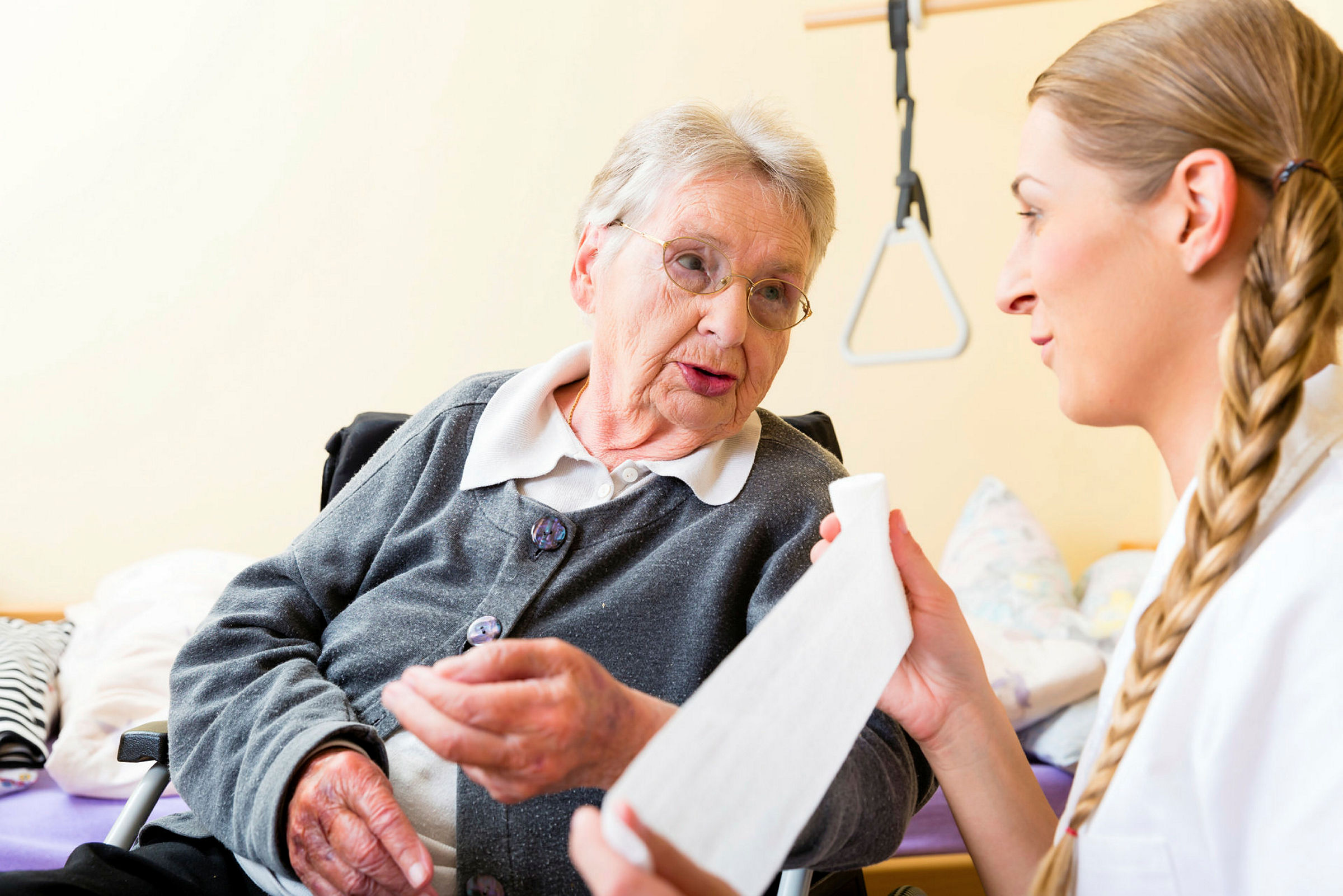 Bildet viser en eldre dame hjemme hos seg selv, og en sykepleier som ruller ut en bandasje mens hun snakker med pasienten.