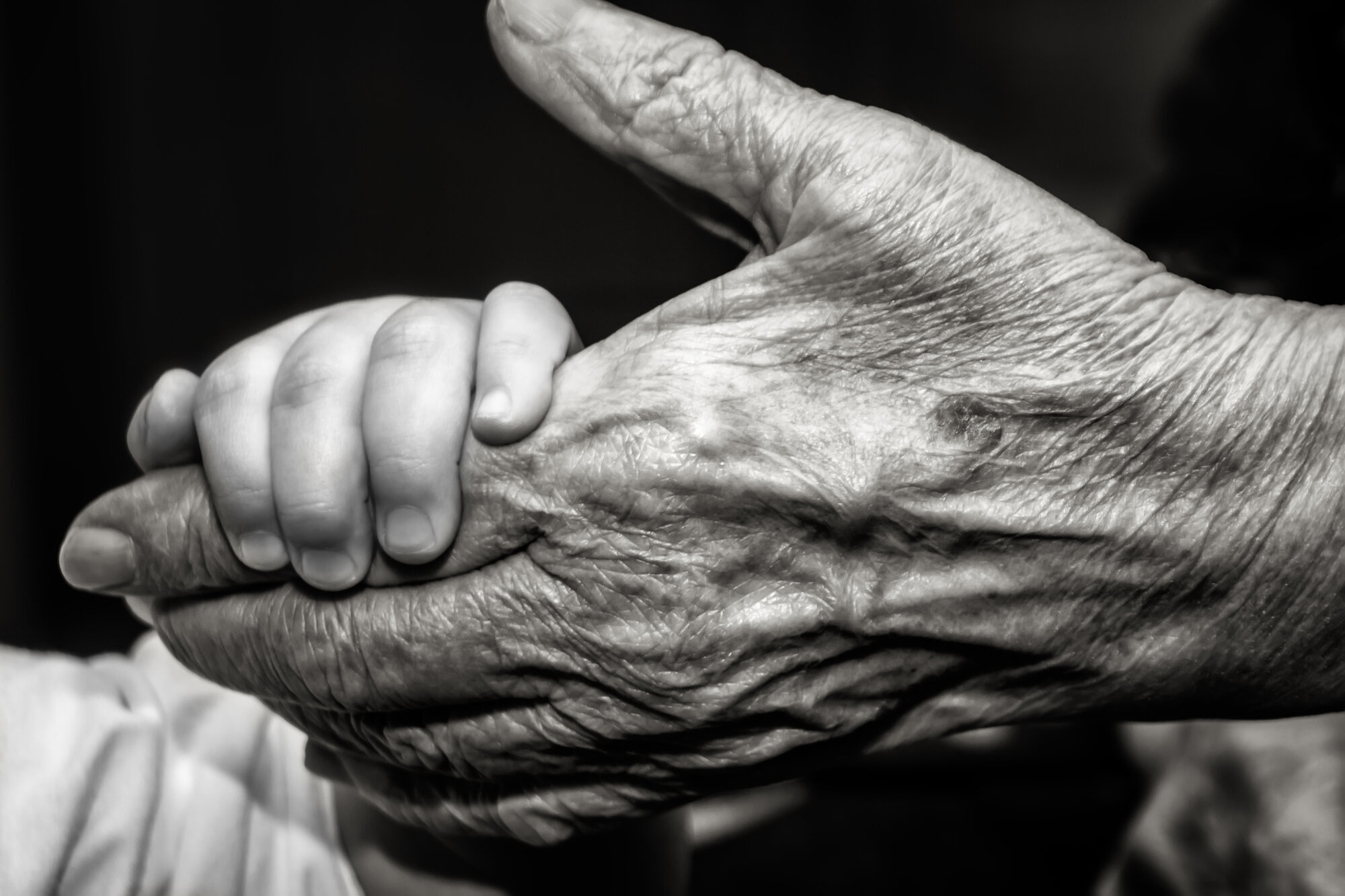 Bildet viser et lite barn som holder et gammelt menneske i hånden.