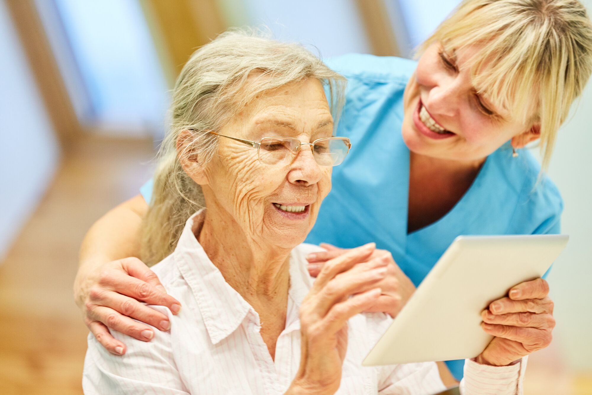 Bildet viser en eldre kvinner som ser på en iPad sammen med en sykepleier