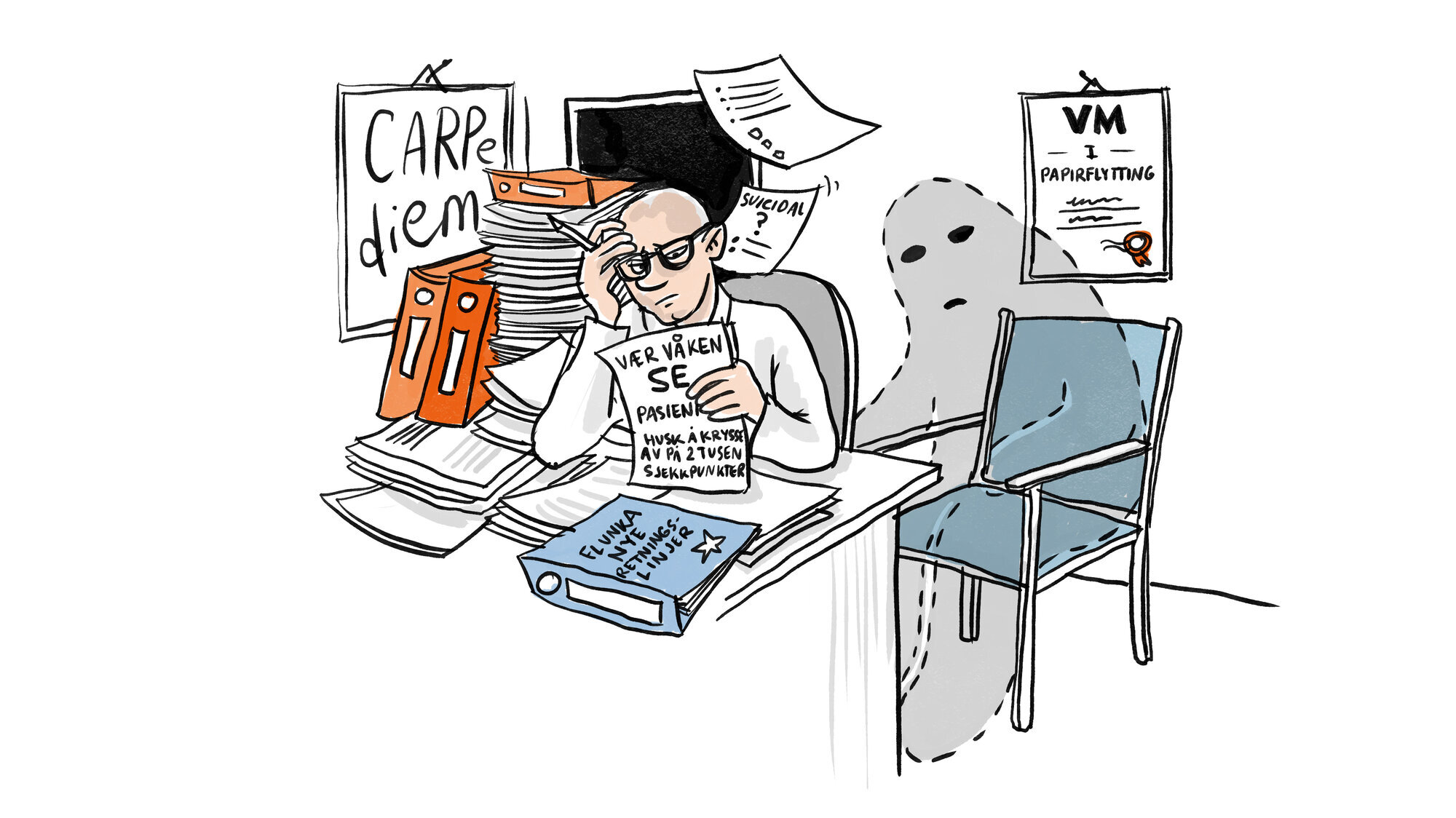 Og den tyngste belastningen kommer ikke først og fremst av at alle retningslinjene og sjekklistene står i veien og forstyrrer kommunikasjonen mellom pasientene og meg, selv om det selvfølgelig er ille nok i seg selv. Den største belastningen kommer av at jeg av bitter erfaring vet at hvis en av pasientene jeg har ansvaret for, skulle ende opp med å ta sitt eget liv, så er det disse sjekklistene og retningslinjene som jobben jeg har gjort, vil bli vurdert opp mot.