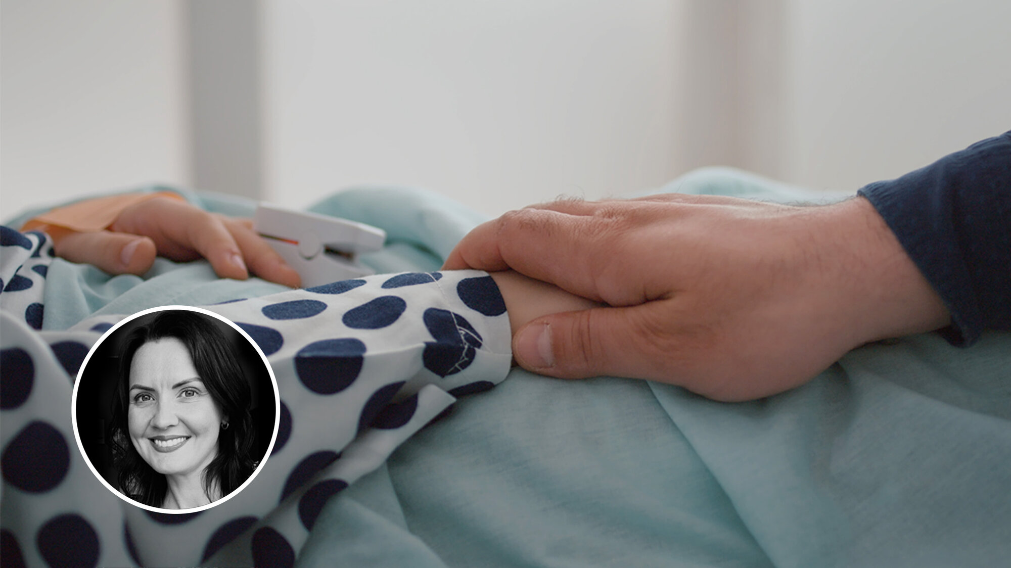 Bildet viser et utsnitt av en voksen hånd som holder rundt en barnehånd. Barnet ligger i sengen.