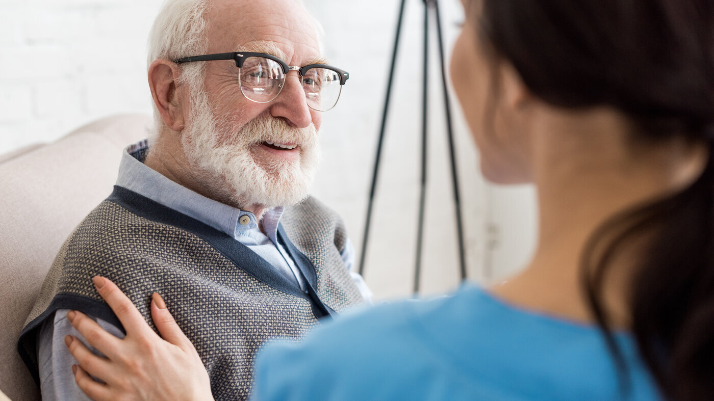 Bildet viser en hjemmesykepleier på besøk hos en pasient