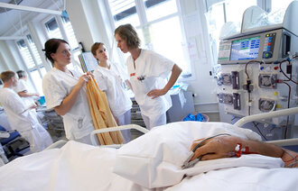 Bildet viser en sykepleier som studerer et skjema ved siden av en sengeliggende pasient.