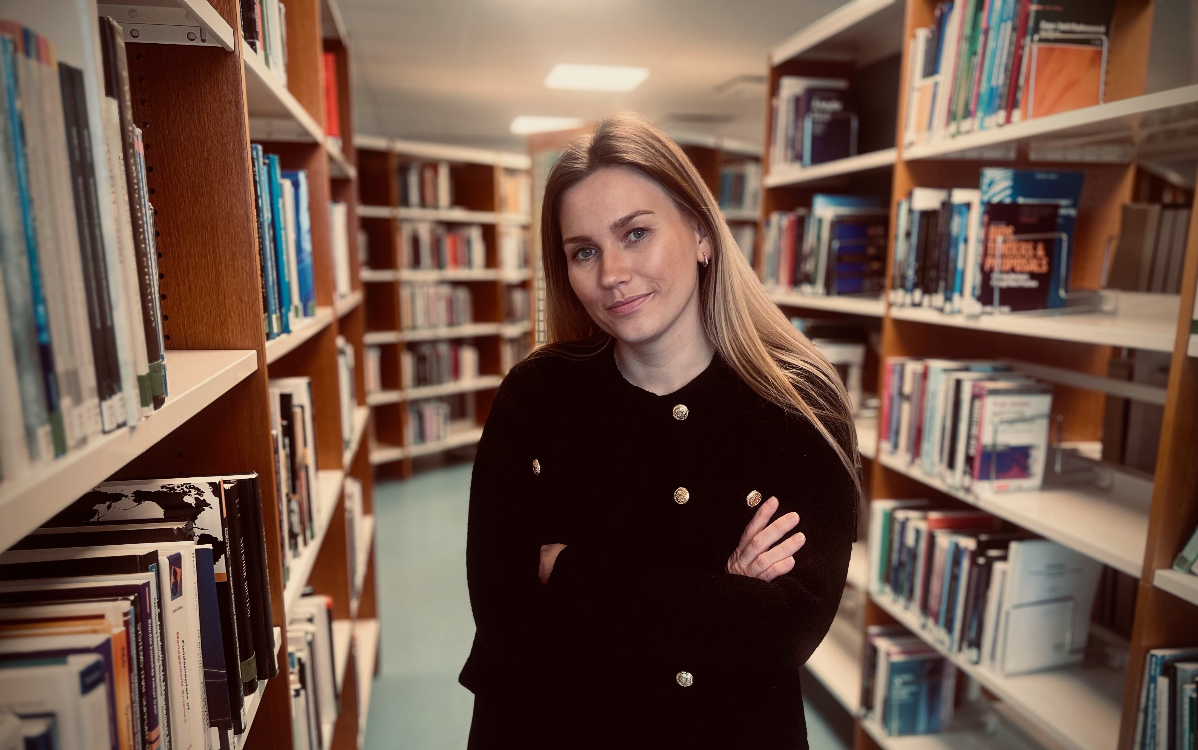 Bildet viser Cathrine Emilie Valgermoe Forren. Hun står i et bibliotek, ser mot kamera og har armene i kors.