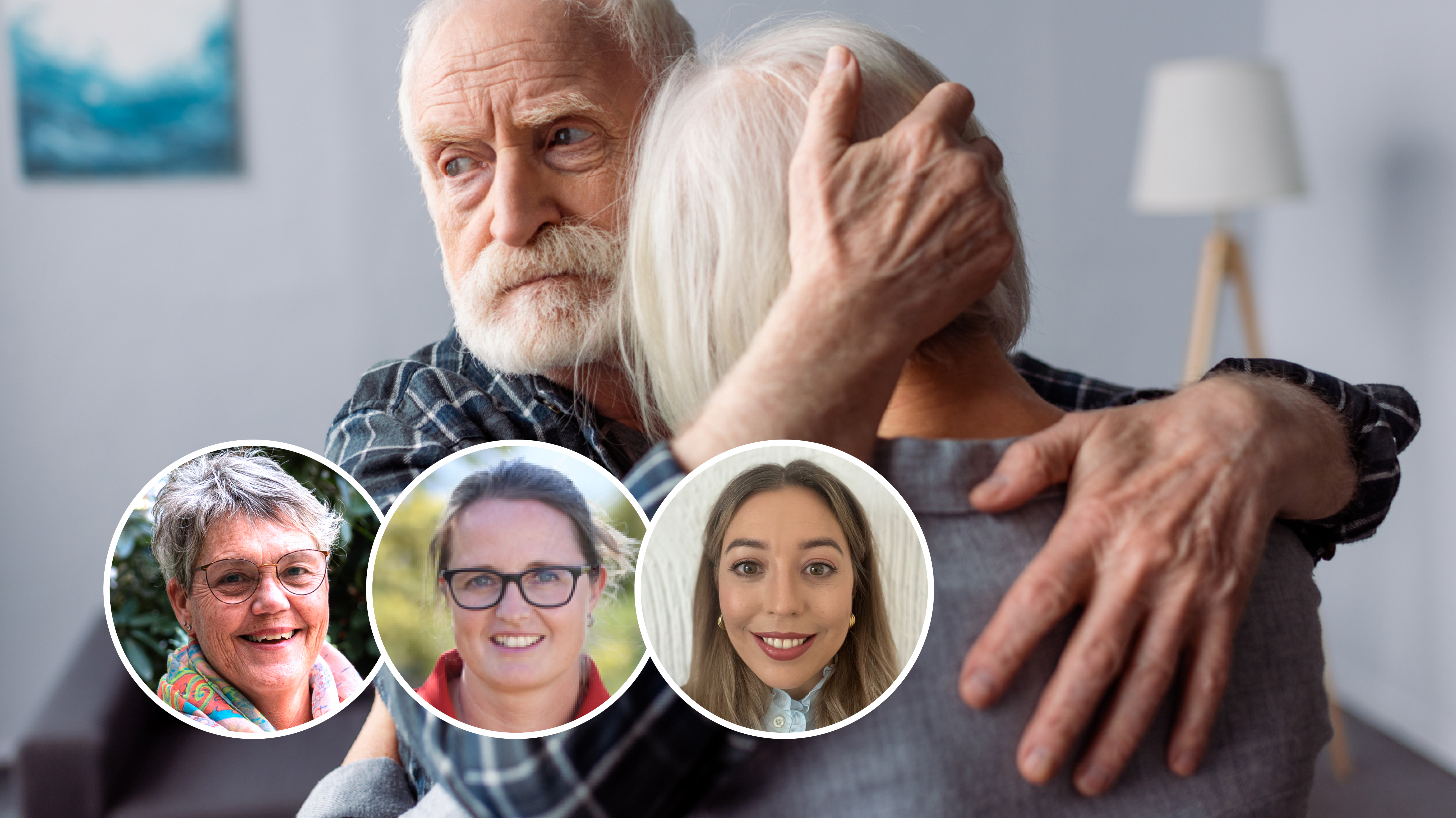 Bildet viser en eldre mann som holder rundt en eldre kvinne omsorgsfullt
