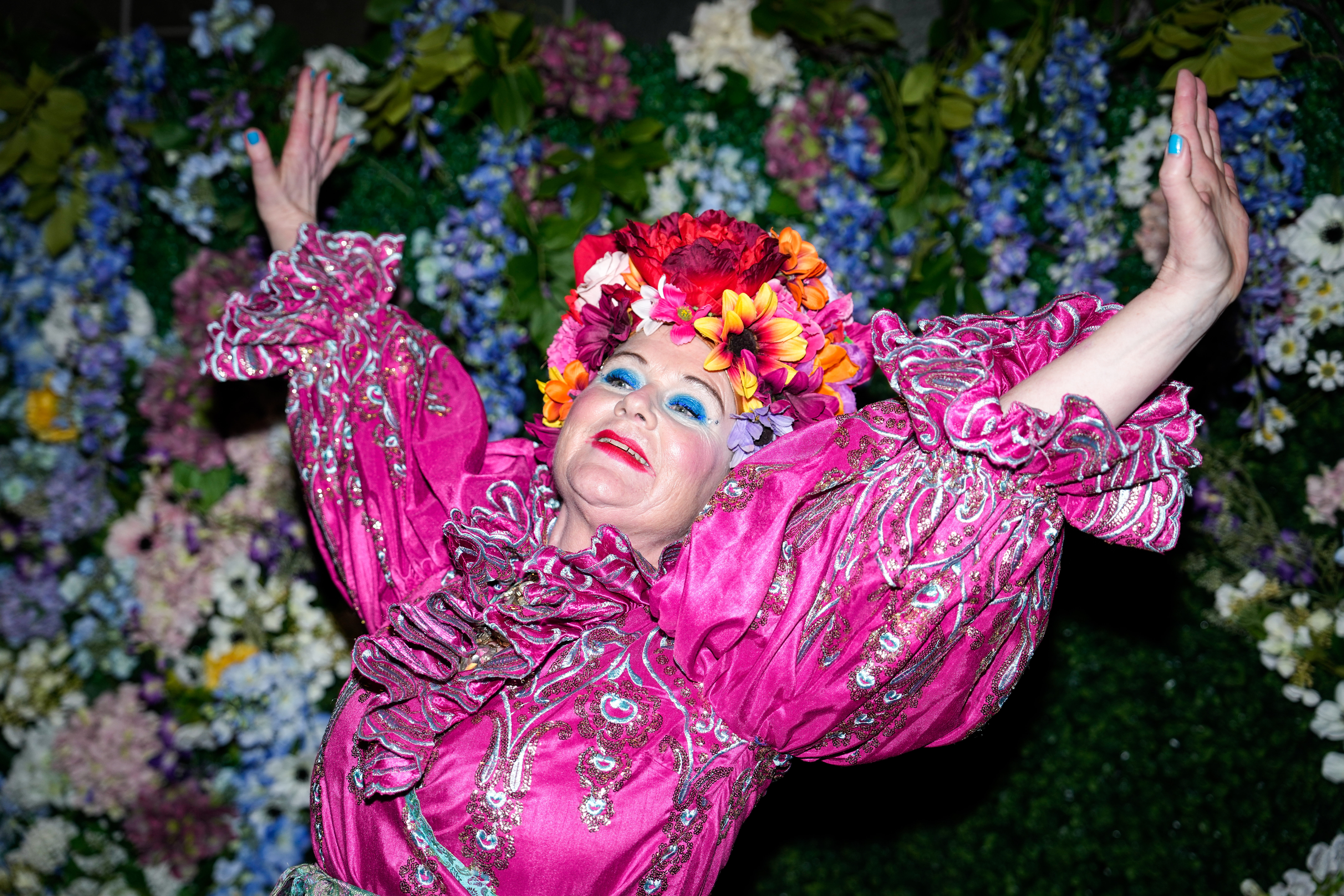 Bildet viser Cathrine Koht som strekker hendene i været. Hun er iført en fargerik drakt