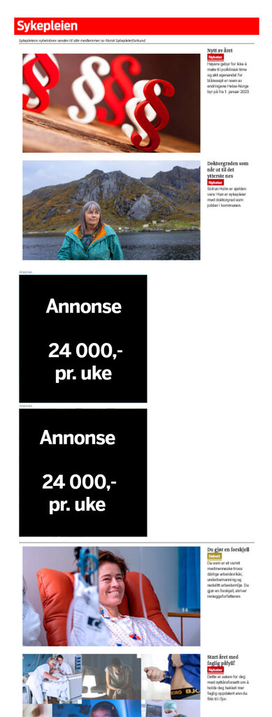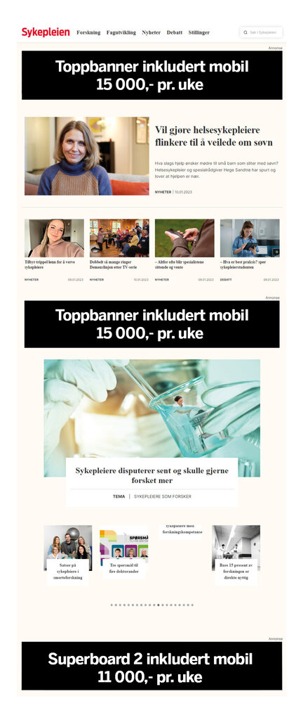 Sykepleien.no har stor og økende trafikk med ca 1 200 000 sidevisninger og 600 000 brukere i måneden. Vi tilbyr flere annonseformater - se priser og plassering under. Kontakt Salgsfabrikken på elisabeth@salgsfabrikken.no eller ring 919 03 208.