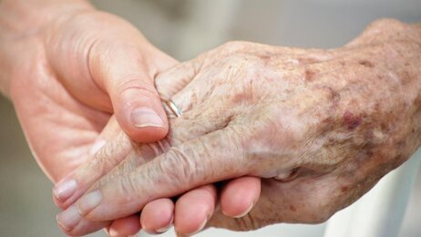 Bildet viser en sykepleier som hjelper en eldre mann med å sette seg opp i sengen