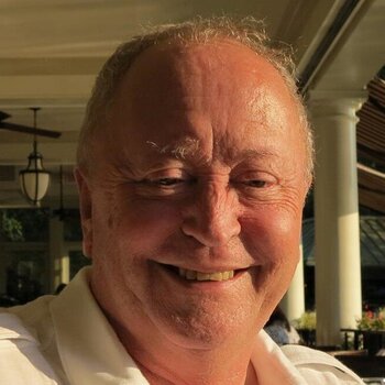 Bildet viser en smilende Jan Pedersen som koser seg på uterestaurant.