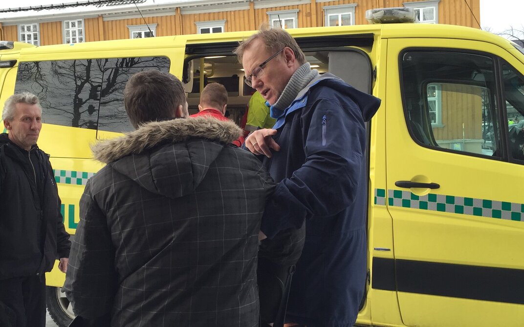 Tilbake til Trondheim: Bare noen få minutter fra oppkallet fra AMK er de på stedet, før ambulansen denne gangen.