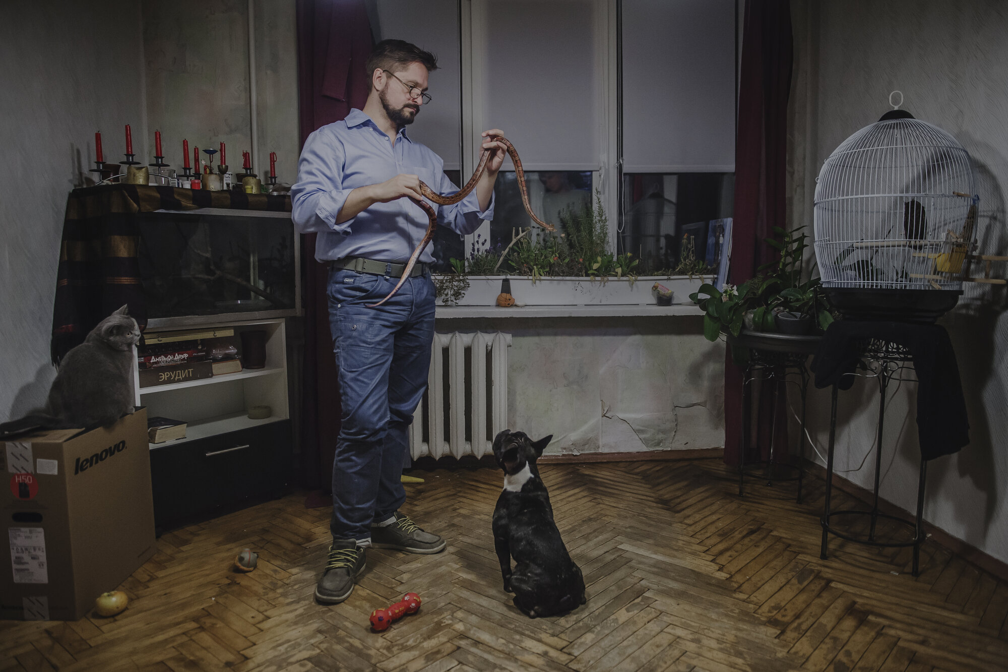 Vi møter Bulitsj i den knappe 30 kvadratmeter store leiligheten i utkanten av Kiev sentrum. En pitbullvalp spretter som en jojo over gulvet, en hårete katt hveser bak en krakk, en ugle glor apatisk ut av buret, mens en gulgrønn slange venter musestille på neste rottemiddag.