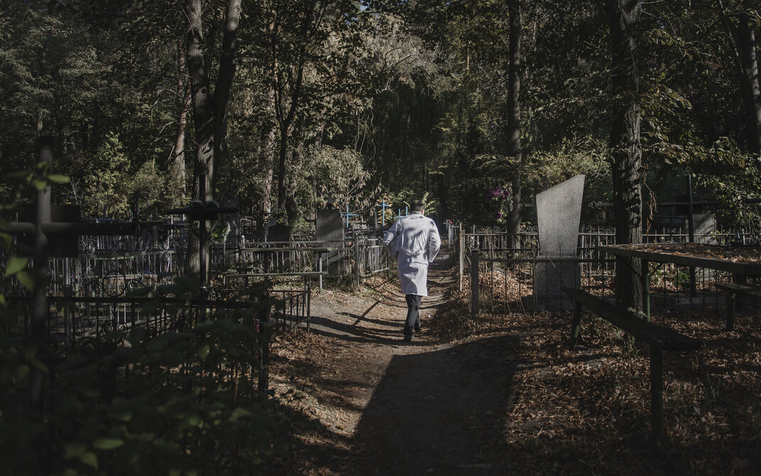 Rett ved kommuneskiltet inn til Kiev, langs en smal motorvei, ligger en liten kirkegård. Hvis du åpner porten til gravplassen, vil du se hauger av sigarettpakker, spritflasker og plastsøppel. Går du videre gjennom kirkegården, legger du merke til de brukte munnbindene som henger i trærne eller ligger slengt ved gravstøttene.