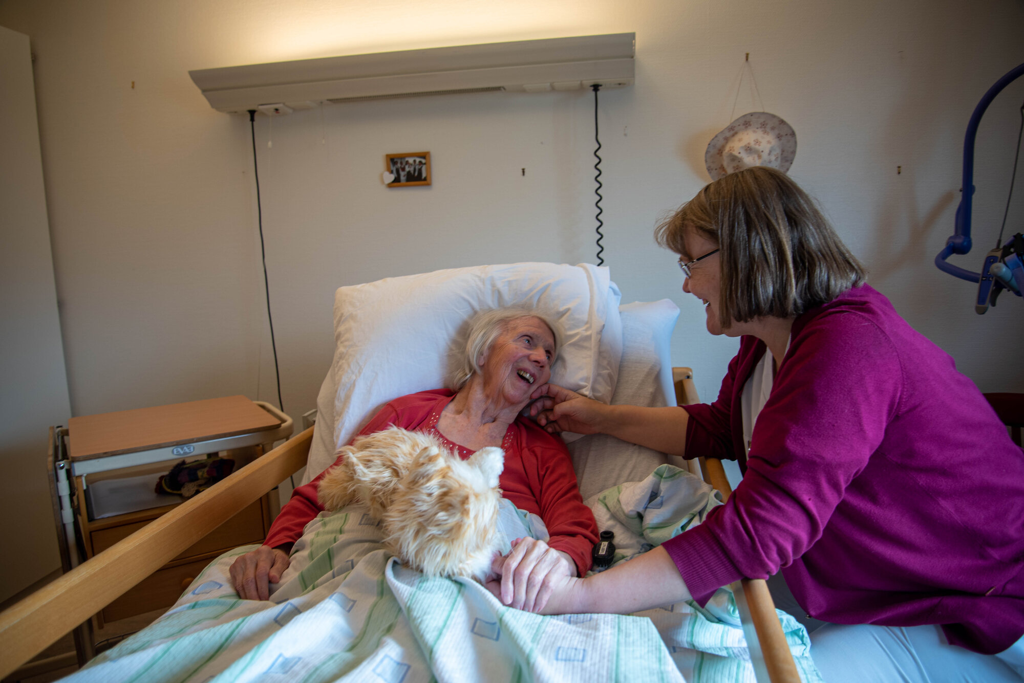 Hun sitter ved sengekanten til Solveig Borge (88). Mellom seg har de robotkatten «Tabby» som har blitt veldig populær allerede etter en måned på sykehjemmet.