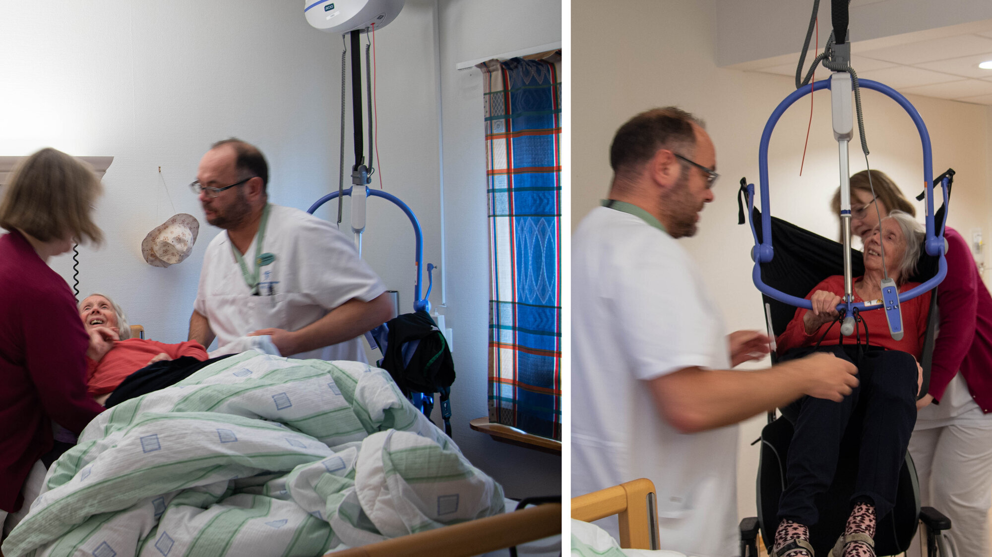 Til slutt legges trekket til løfteheisen under Borge. De tar av sengehesten og heiser henne over i rullestolen.